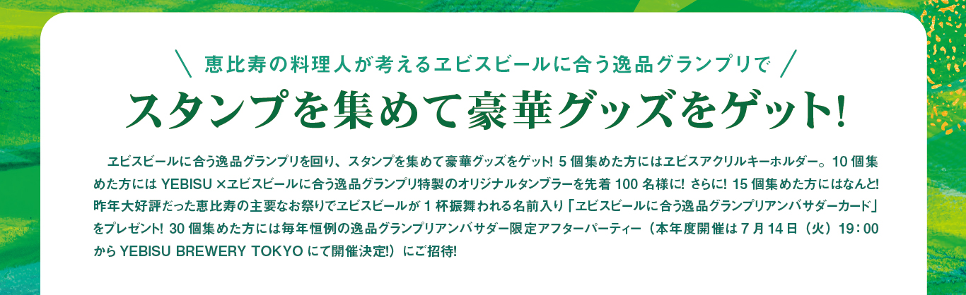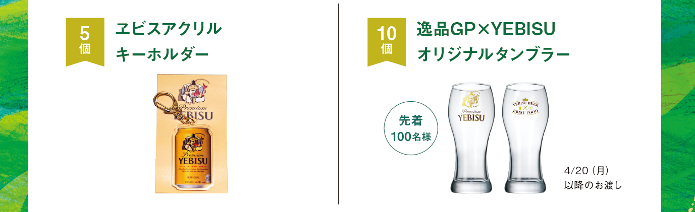 スタンプを5個集めた方はヱビスアクリルキーホルダーをプレゼント。10個集めた方は特製逸品グランプリ×YEBISUのオリジナルタンブラーを先着100名様にプレゼント!(受取は4/20以降のお渡しです)