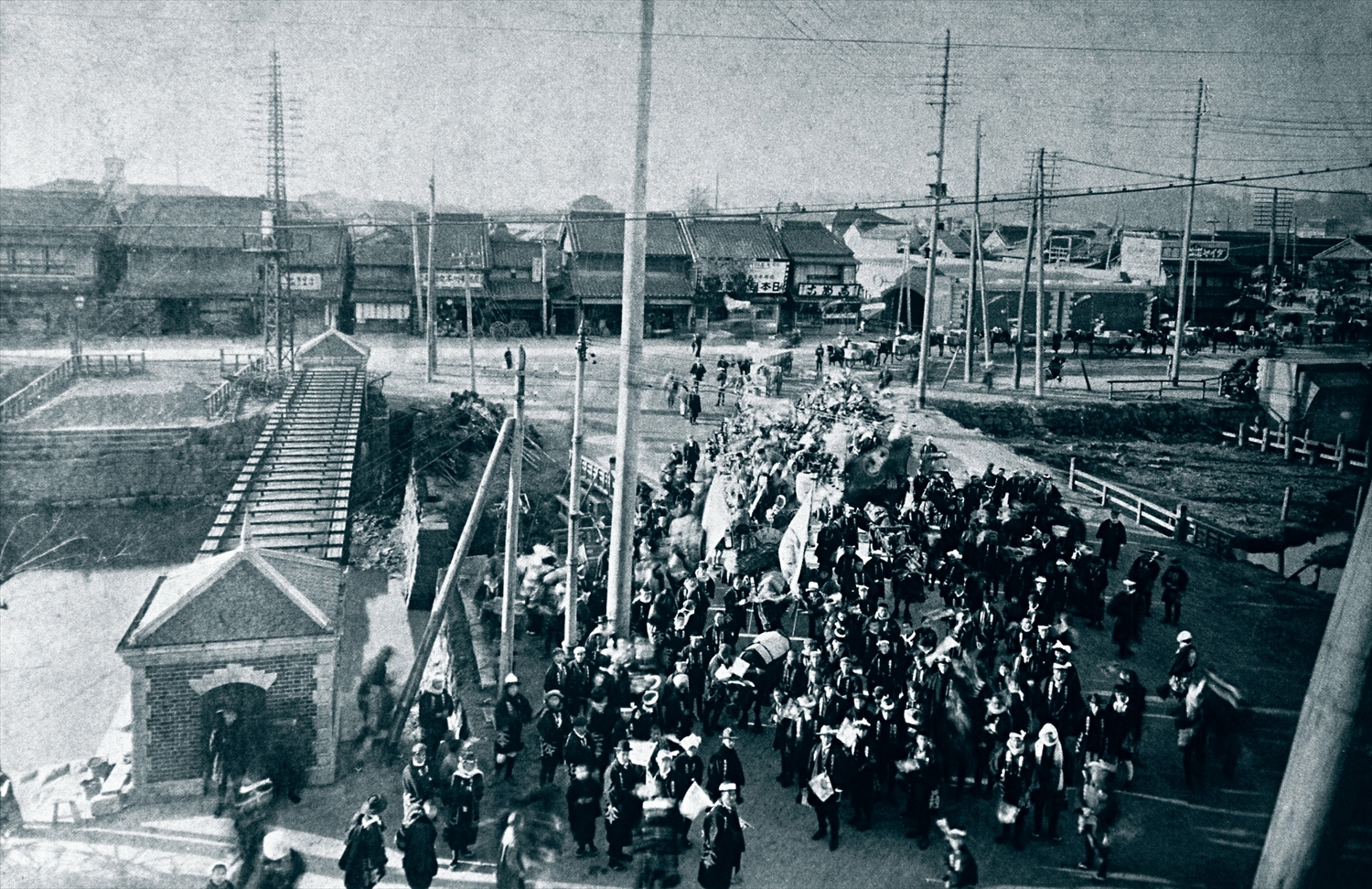 さかのぼること136年前。現在の恵比寿ガーデンプレイスの場所に1889年に誕生したヱビスビール醸造場。のちに「東洋のビール王」と呼ばれることになる「馬越恭平」はヱビスビールを日本一のビールにする為に数々の画期的なアイデアを打ち出し人気を博することになりました。その施策の一つがこちらの写真にある「初荷(はつに)」と言われる行事で新年ヱビスビールの初出荷を工場から渋谷川沿いに社員の皆さんが半纏を羽織り行列をなして日本橋まで練り歩きました。今でいう「PR施策」を打ち出しました。当時は「これを見ないと正月を迎えた気がしない」という街の風物詩だったそうです。