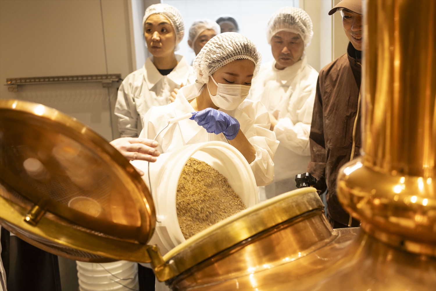 ビールは「水」「麦芽」「ホップ」「酵母」4つの素材から作られます。まず最初は「大きな窯に砕いた大麦芽を投入しておかゆを作る」という行程からスタート。糖化(マッシング)という行程で砕いた麦芽をお湯と混ぜ、酵素の働きでデンプンを糖に変える作業です。ヱビスブランド Chief Experience Brewer有友 亮太さんが丁寧に作業工程を説明しながら慎重に投入。
