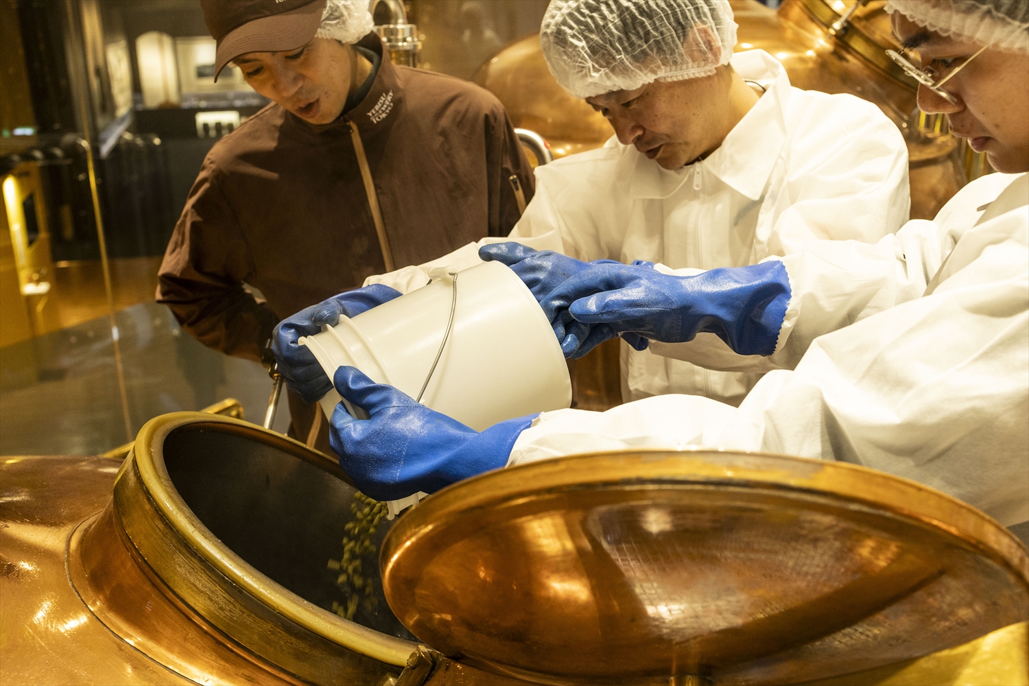 先程の「糖化(マッシング)」から「ろ過(ロイタリング)」という糖を含んだ液体(麦汁)と麦芽粕を分ける作業工程を経てこれから「煮沸(ボイリング)」という麦汁を煮沸し、ホップを加える工程に移ります。ビールには欠かせない主役と言っても過言ではない「ホップ」。今回の「ヱビス∞(インフィニティ)初仕込」はテトナンガー(Tettnanger) というドイツ産のファインアロマホップが一部使用されています。これは、1890年のヱビスビール誕生当時に使われていたと考えられる伝統的なホップだそうです。